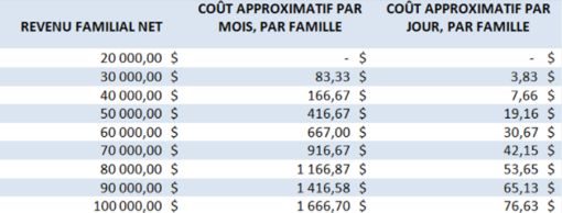 | REVENU FAMILIAL NET | COÛT APPROXMIATIF PAR MOIS, PAR FAMILLE | COÛT APPROXIMATIF PAR JOUR, PAR FAMILLE |